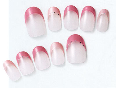人差し指と小指を薄いピンクで細いフレンチにし、その他の指は、濃いピンクのフレンチに。バランスを見ながら、シルバーの小さなスタッズをフレンチのラインに沿ってグルーで付けてみて。