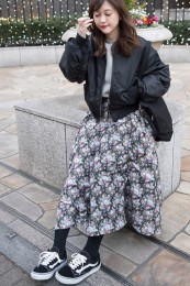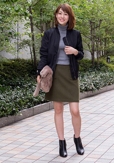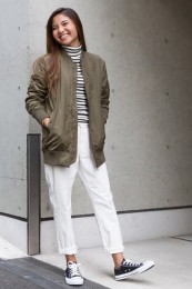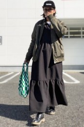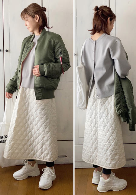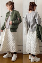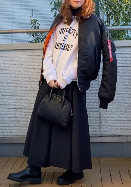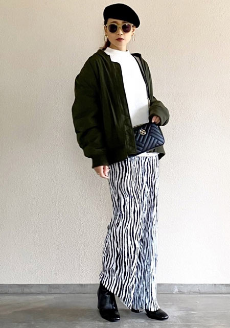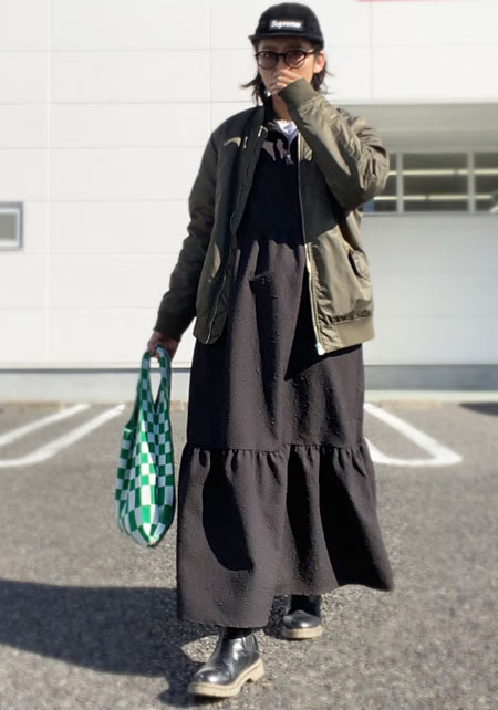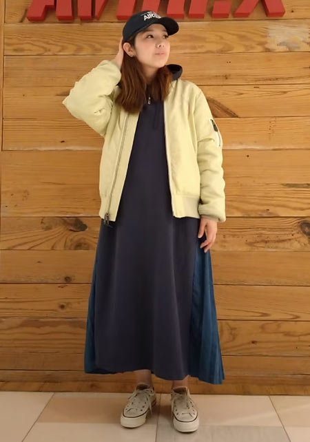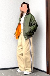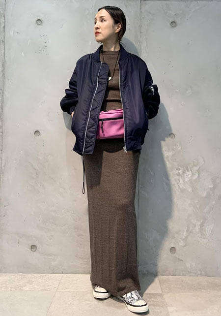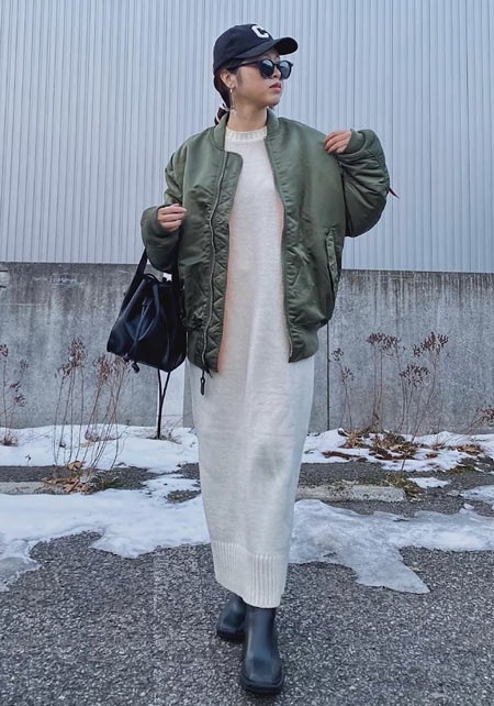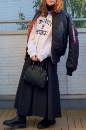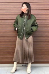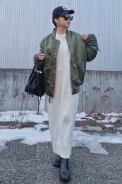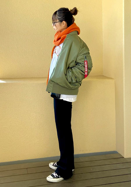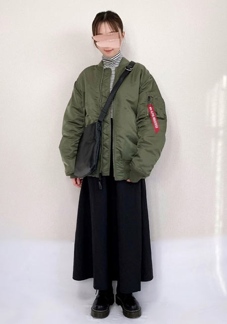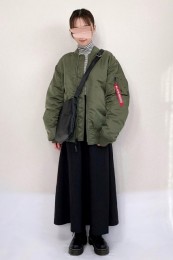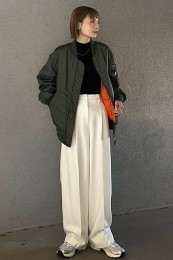 デニム合わせはもちろん、ワンピースやスカートにも合わせていける、今季トレンドのミリタリーアウターのMA-1。