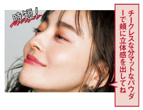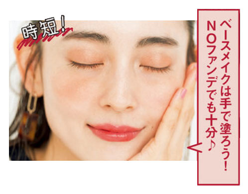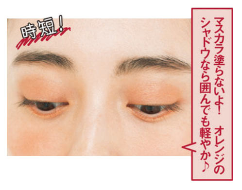 チークやリップと同系色のオレンジやコーラルピンクでまぶたに色を足す程度にしてね。肌もファンデじゃなく、トーンアップ下地でナチュラルな透明感を出すだけでふわっと明るく見えるゴテゴテ盛るより、ほんのり色づくメイ作るのも早いよ!(笑)