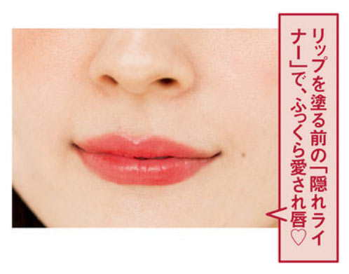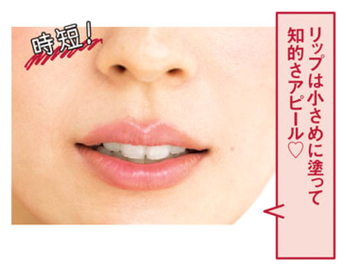 ピンクベージュのFを、唇の輪郭から少し内側、ちゅちゅっと小さめに塗る。唇はぼってりさせず主張弱めの方が清潔感が出るよ!