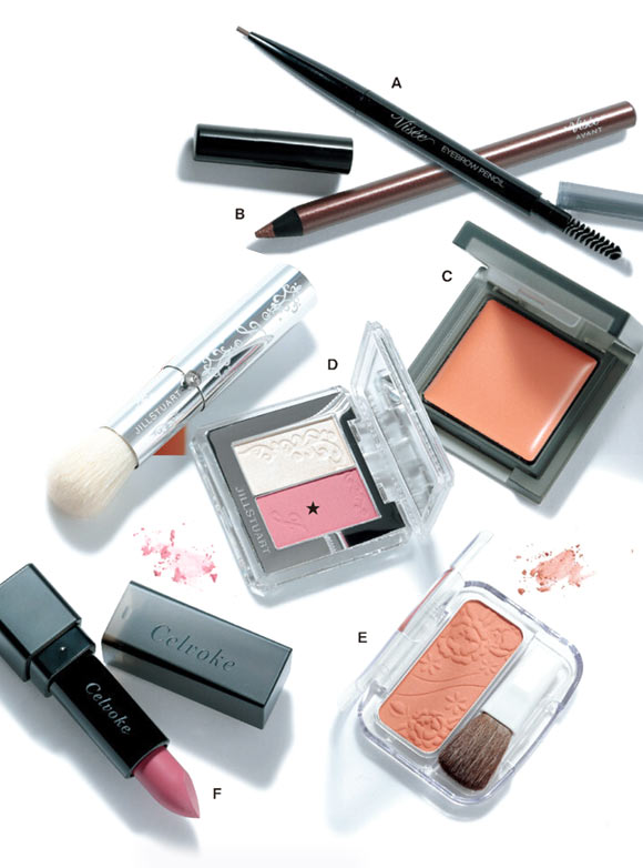 Aのペンシルで眉の輪郭をしっかりと強調して凛々しい印象に。目元はCをまぶた全体に塗ったらBのブラウンライナーで引き締めて。