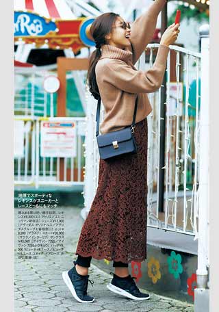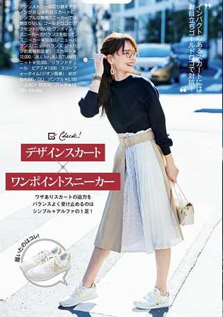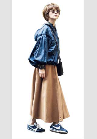 流行最前線のハイテクモデル。今年は女らしいふんわりスカートにこそ、こういう重めのハイテクなスニーカーを合わせて旬顔に。
