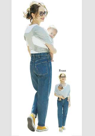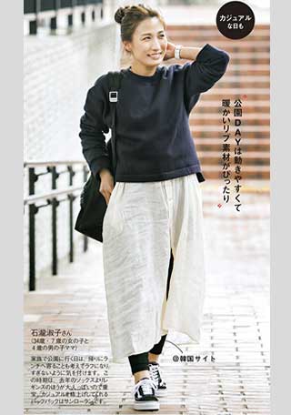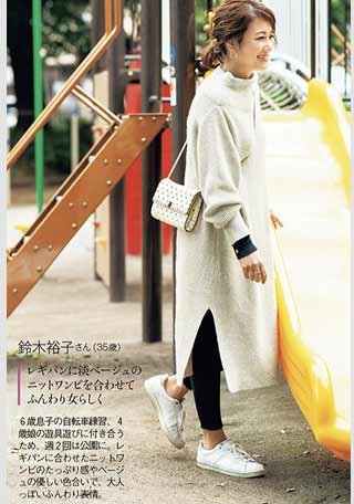 〈右・コーデ〉淡いコーデになじむ白スニーカーはママにも人気。ひもなしタイプは両手がふさがっていてもサッと履けるママの強力な味方。\1842