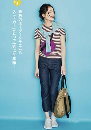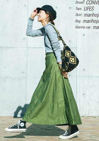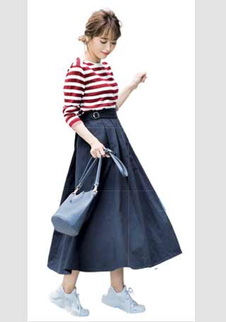 〈コーデ〉ボーダー×白スカートの淡い着こなしには、足元に差し色を入れて引き締め。濃いカーキのスニーカーなら足元が目立ってメリハリが生まれます。スポーティな雰囲気も今年らしくて◎。
