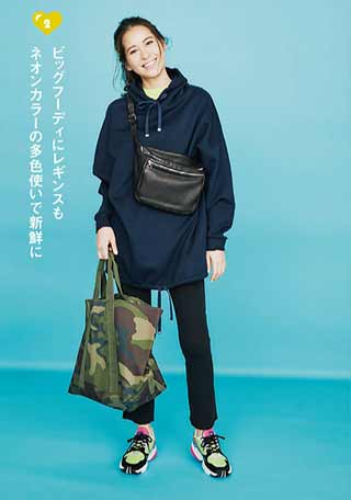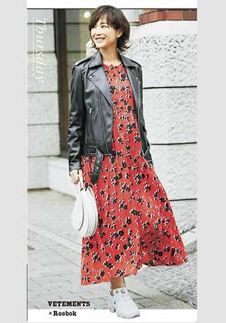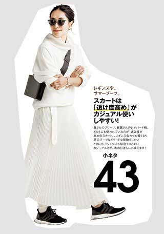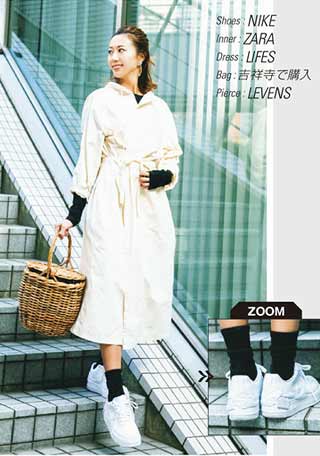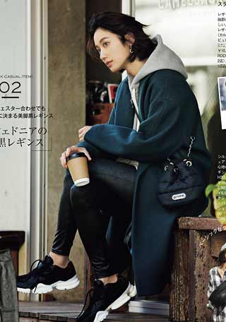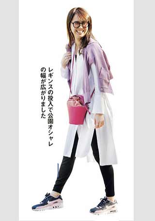 1.どこか1つは必ずキレイめなアイテムを入れる。例えばロングシャツ+レギンスも、ダッドスニーカーで瞬時に今年風に。