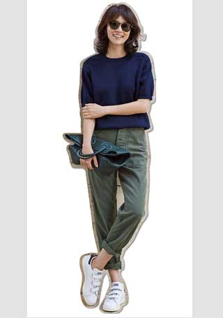 1.ハイウエストパンツで腰高に見せる! ウエスト位置を高めに設定すれば、下半身が細くみえるので脚長効果が期待できます。