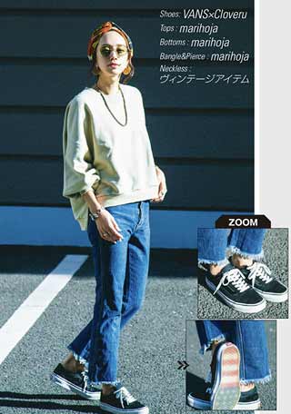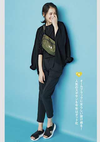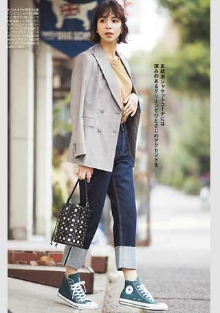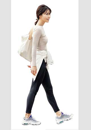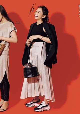ソールにやや厚みがあり、足元にボリュームが出るハイテクスニーカーが、今年は大流行! 足首をチラリと見せて軽やかに履くのが、バランスのよいコーデをつくるコツ。ボトムは、足首が見える丈を選んで。