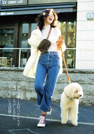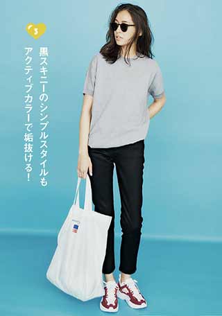 4.人気のスキニーパンツもダッドスニーカーで足元にボリュームを作ると旬のシルエットに。1番合わせやすいのは黒スキニーだけど、今季トレンドのキレイめなカラーパンツにも相性よし。足首は見せて抜け感を作るのはマスト。