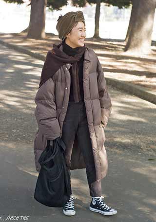 3.テーパードやセンタープレスなどのキレイめパンツにダッドスニーカーも好相性。この場合、アウターはシャカシャカ素材でバランスを。