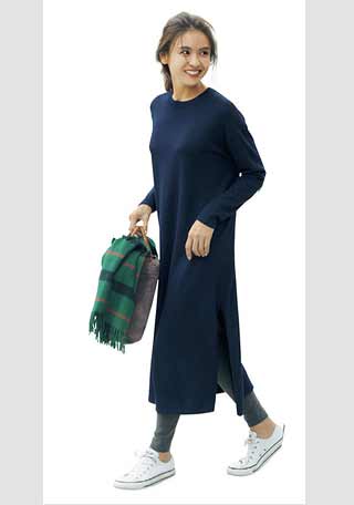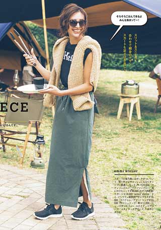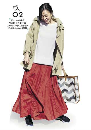 3.落ち感ロングにトップスアウトで縦感発揮! スカートの縦の流れを後押しする、裾出しスタイルで、すっきりシルエットを強調して。