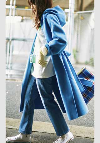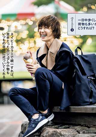 〈コーデ〉ネイビー×グレーのベーシックカラーコーデの足元には、差し色のパステルブルーをひとワザきかせ、明るい表情にアレンジ。