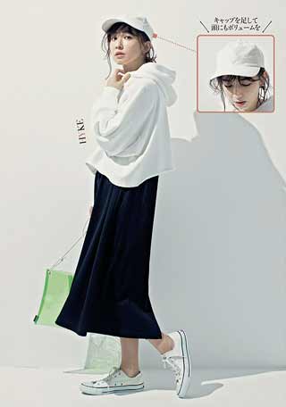 〈コーデ〉柄物のセットアップをさっぱり夏らしく着こなすには、さわやかな白スニーカーがマスト! スカートとスニーカーの間にチラリと肌がのぞくと、抜け感が出ていっそう軽快に。
