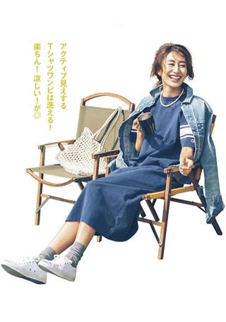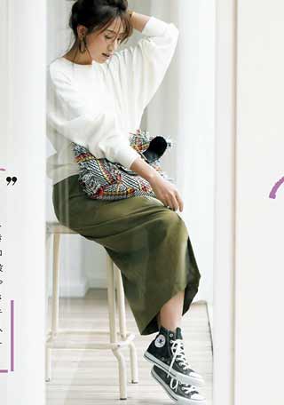 〈コーデ〉ワンピース風のオールインワンは、1枚着るだけで様になる、ワーママの便利アイテム。スカートの部分は前ボタンを開けて肌見せして着るときは、セクシーになりすぎないようボーイッシュな「オールドスクール」が使えます。