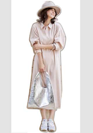 〈コーデ〉これまでなら白のコンバースを合わせがちだったシャツワンピのコーデ。今季はニュアンスベージュにシフトするだけで洗練度が高まります。