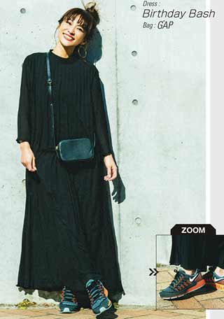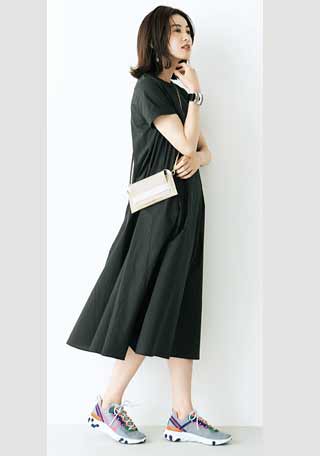 2.女らしいコーデのハズしにもちょうどいいダッドスニーカー。ワンピースなら、ふんわりシルエットではなくタイトにしてIラインを強調。