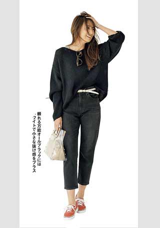 4.スキニーパンツにはふわトップスでメリハリを! 下半身を細身にまとめるとスニーカーの着こなしもスタイルよく、トップスはゆるめが正解。