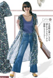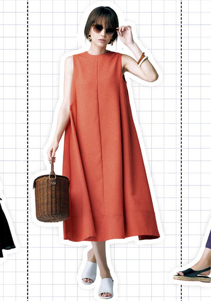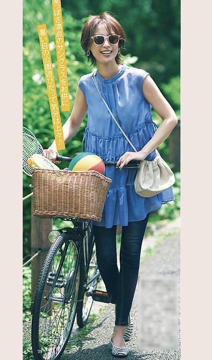 フィット&フレアシルエットの王道フェミニンスタイルを仕上げるアウターに、落ち感素材が、ママらしいリラックス感を叶えてくれます。明るいコーデにはサングラスがアクセントに一役。