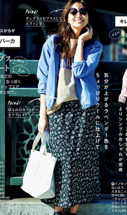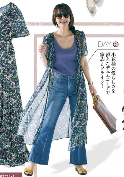 見慣れたフェミニンな花柄スカートもジレを羽織りサングラスをかけることでシャープさが加わり、新鮮な気持ちで着られます。