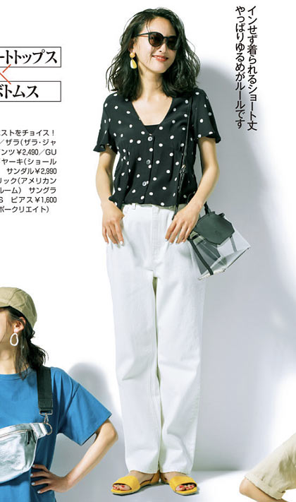 スーパーは冷えるから薄手の羽織り必須。今季ならカーデよりも透け感シャツで、トレンドを意識しつつ冷房対策。