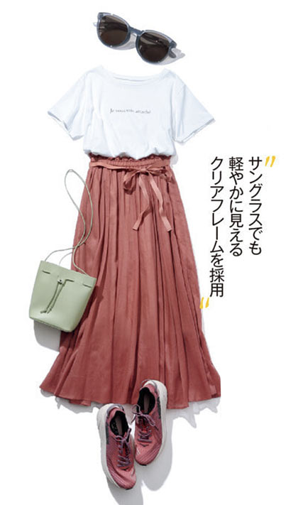 柔らかな雰囲気とともに夏らしい遊び心を満足させてくれるポップさも備えたニュアンスのあるカラーフレームサングラス。ふんわりトップスにも可愛げがあるから、キメすぎにならず、ハッピーな雰囲気をキープできます。