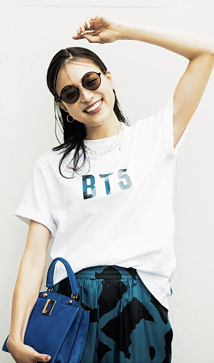落ち着いたくすみブルーが、白Tでは出せない大人な雰囲気。フェミニンな花柄スカートを、ハンサムな黒サングラスがピリッと大人めに引き締める。