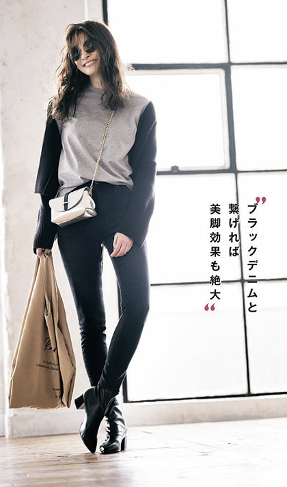 ミドルゲージのニットチュニックはスキニーデニムでメリハリを。ちょっと物足りない…という時にこそ黒グラサンでクールに。