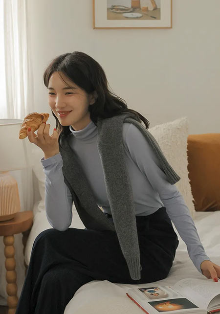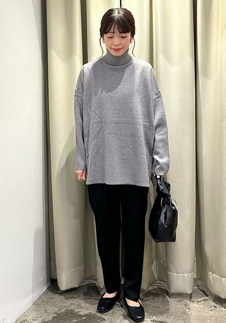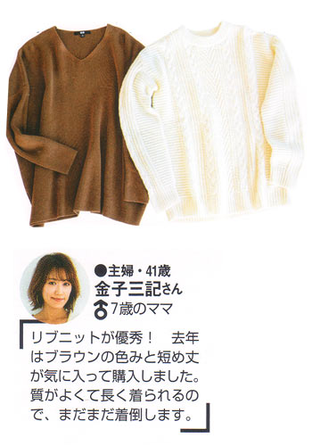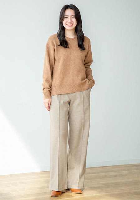 シンプルなデザインだから、どんなシーンでも大活躍! つい毎年更新しちゃう、ママの制服状態のニット。肌ざわりがよくて産後の敏感肌でもチクチクしません。