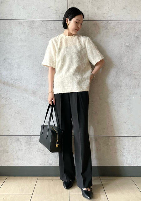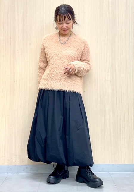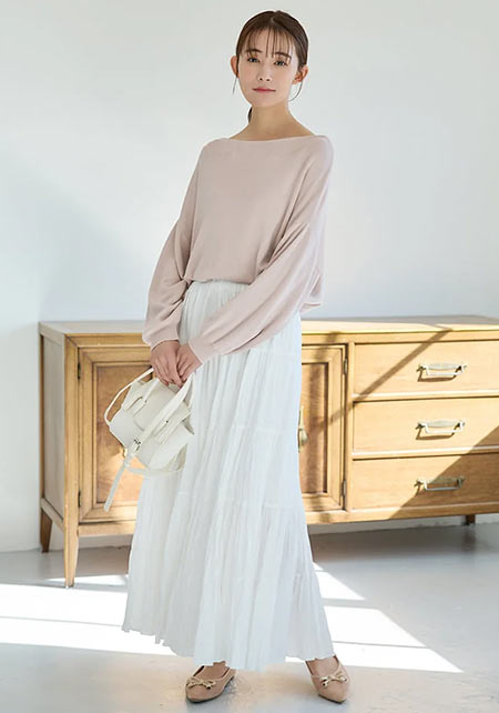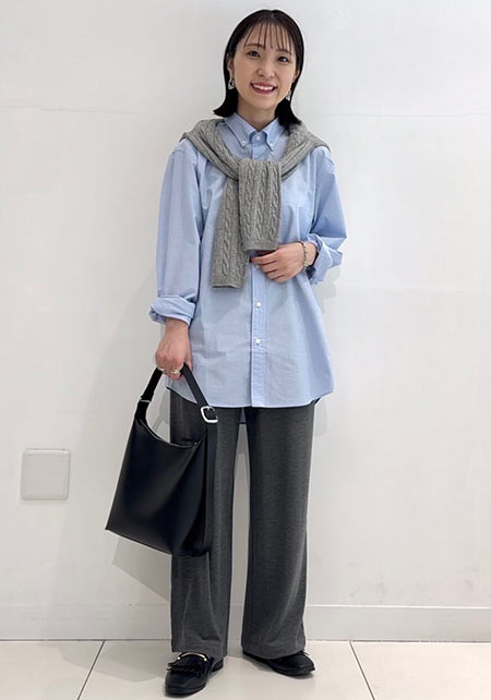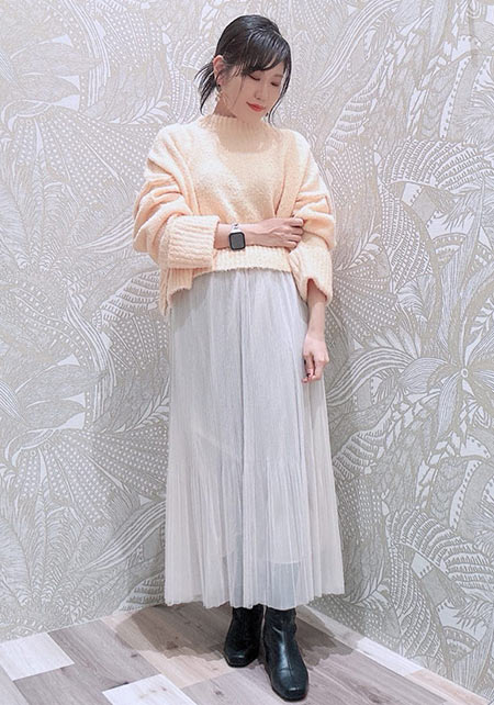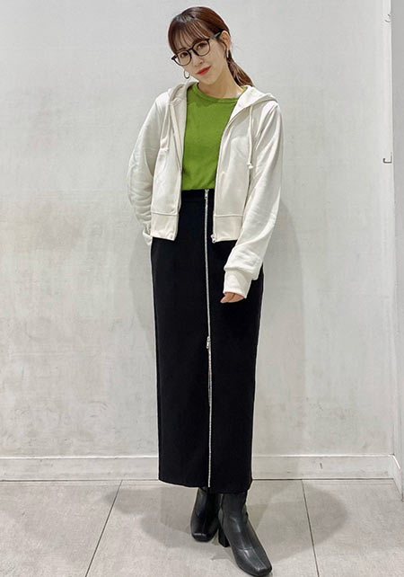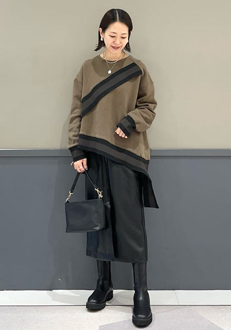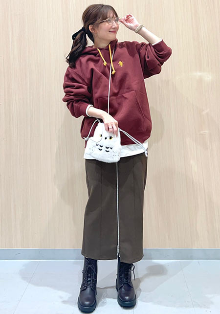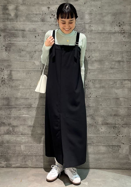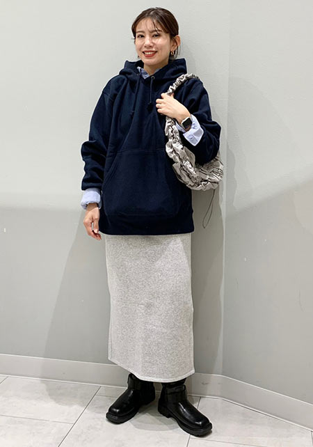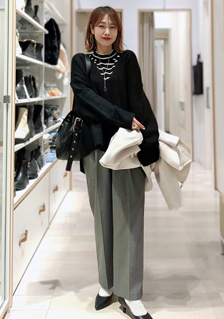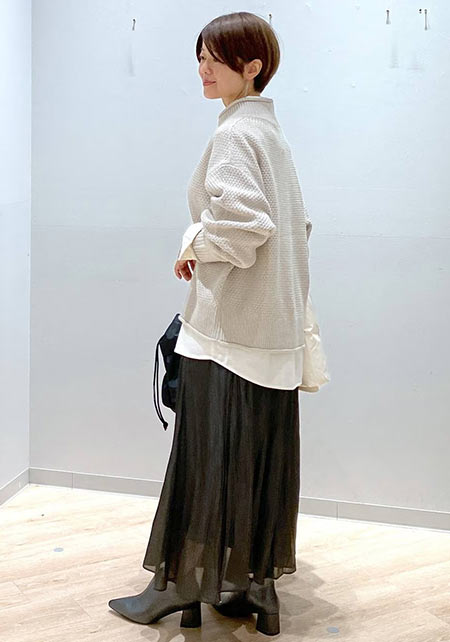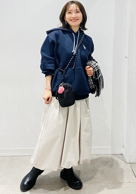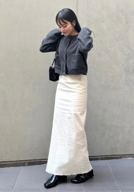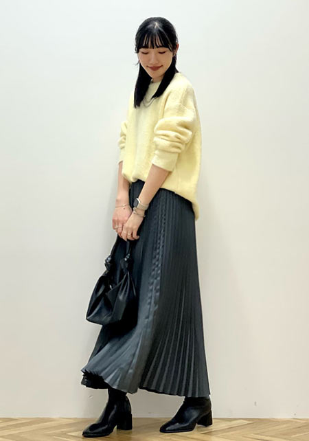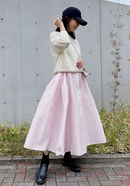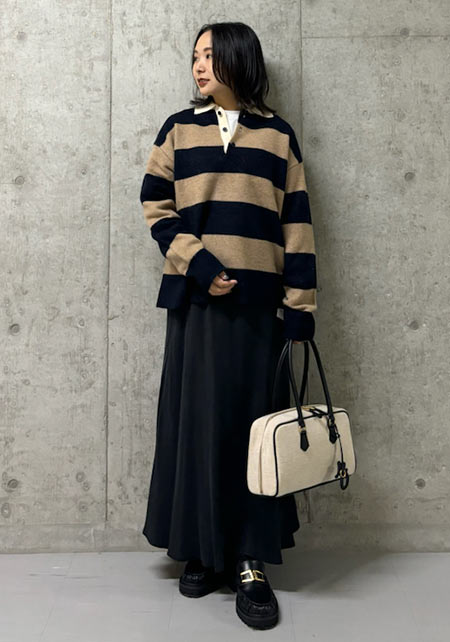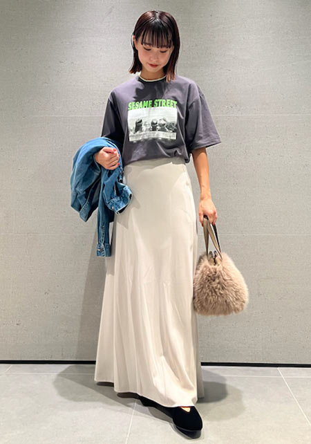 シンプルだけど、素材とかデザインが“普通すぎない”のがアメホリの良いところ。手持ちのユニクロのスカートにも即なじんで、トレンドコーデに。バッグはLattice、靴はRANDAのもの。