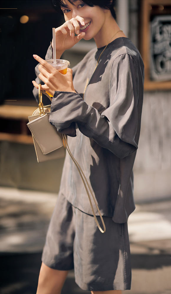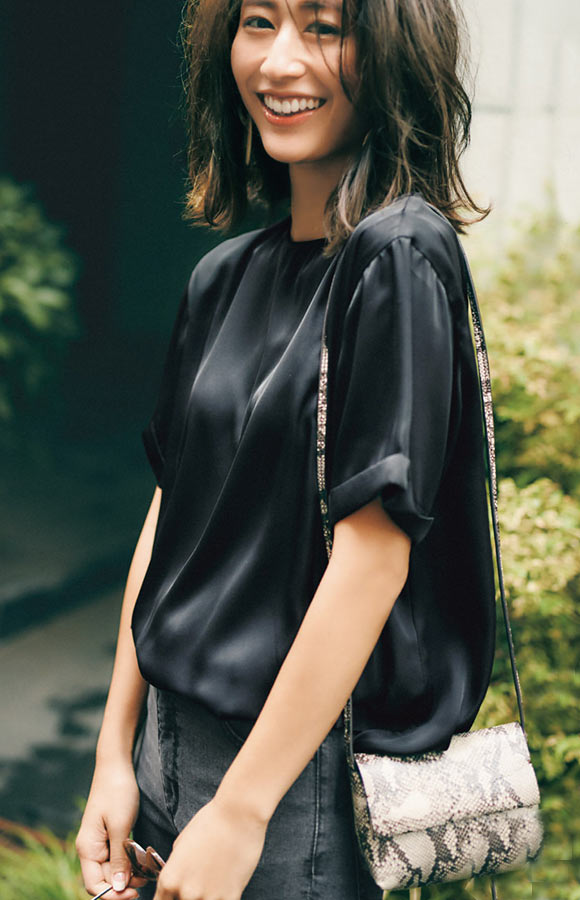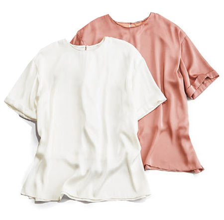 昨シーズン、店頭に出た途端に完売したシルク風のTシャツ型トップス。形はシンプルでも、素材が変わるだけでリッチな印象に。秋めく素材感は残暑にもぴったりです。