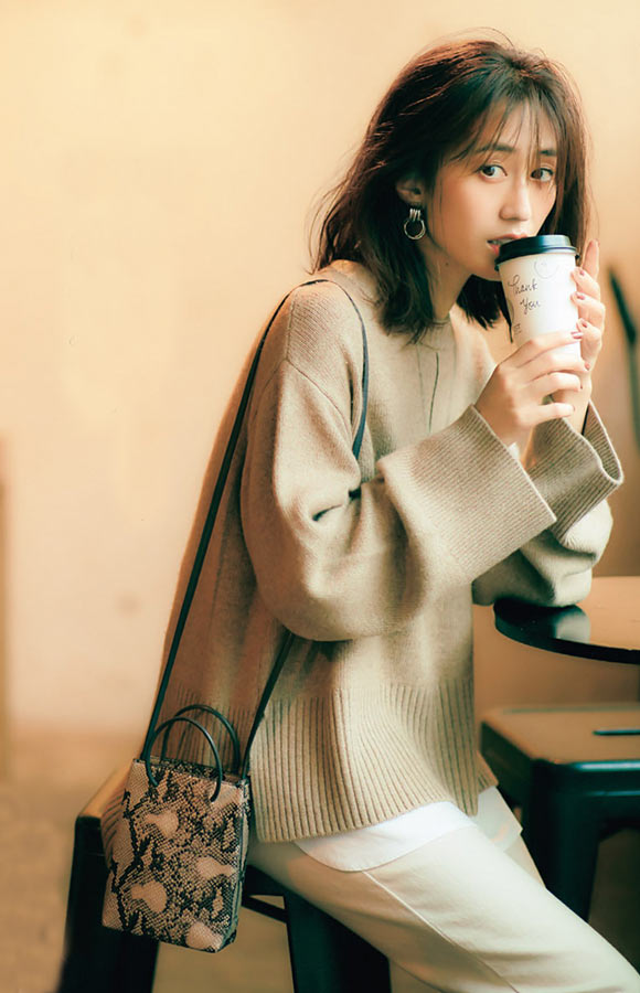 ミラオーウェンが得意とする1枚着のレイヤードアイテム。ニットはさらに今年らしさが出るようざっくりと大きめに仕上げ、裾からちらっとのぞくクリーンな白シャツが女性らしさを醸し出します。インナーシャツの着丈はお尻がちょうど隠れるのも嬉しい。