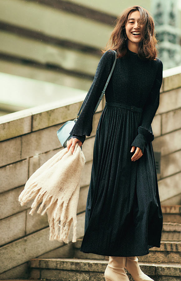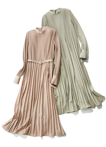 定番のジョーゼット素材を使った女らしいワンピースは、冬のお呼ばれシーズンにも活躍してくれるコーディネートいらずの一枚。同じメンバーの集まりでもベルトの有無でイメチェンも叶う一枚です。細プリーツのほか詰まった首元やクラシカルな雰囲気など今年らしさも満点!