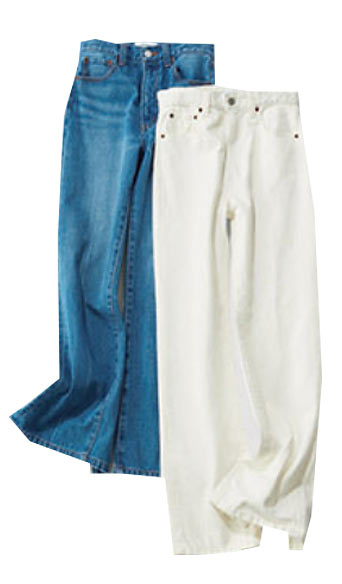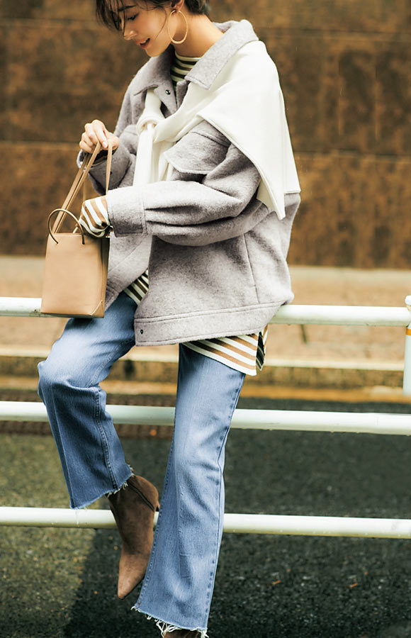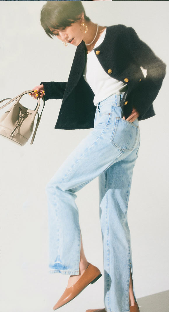 脚がほっそり長く見えることにこだわったフレアラインと削り加工に、センタープレスを施した、大人のためのトレンドデニム。この時期ならショートブーツと合わせて、上品で洗練された印象に。履き心地のよさもリピーターの多い理由です。