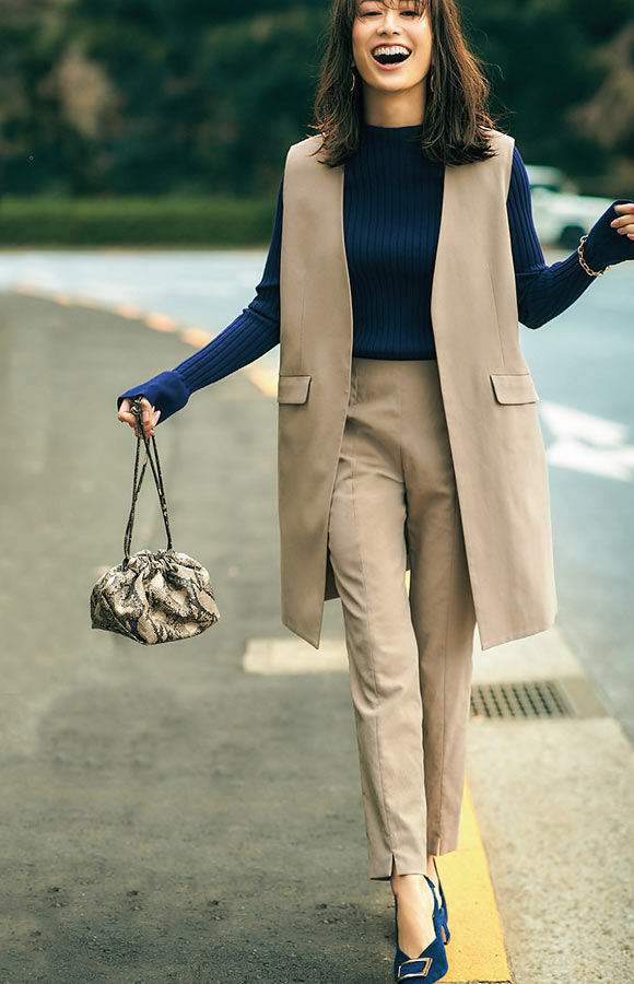 今季注目のベストを合わせることで、ほんのりモード見えが叶います。