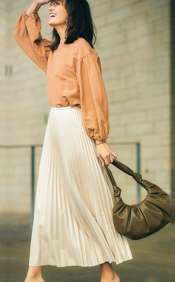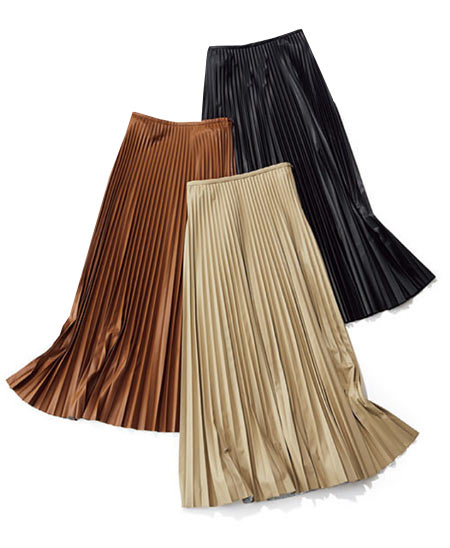 薄く軽やかな素材感でレザー特有のハードなイメージを払拭。エレガントに楽しむことができる新感覚プリーツです。ウエストやヒップ周りもスッキリ見えるアコーディオンプリーツに、裾に向かって重さを出したシルエットも女性らしく見えるポイントです。ワントーンでまとめて春らしい印象を楽しんで!