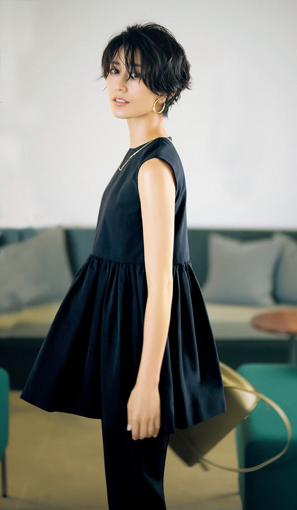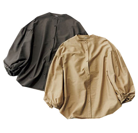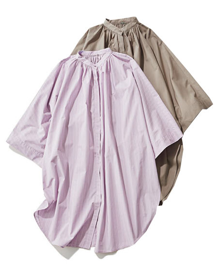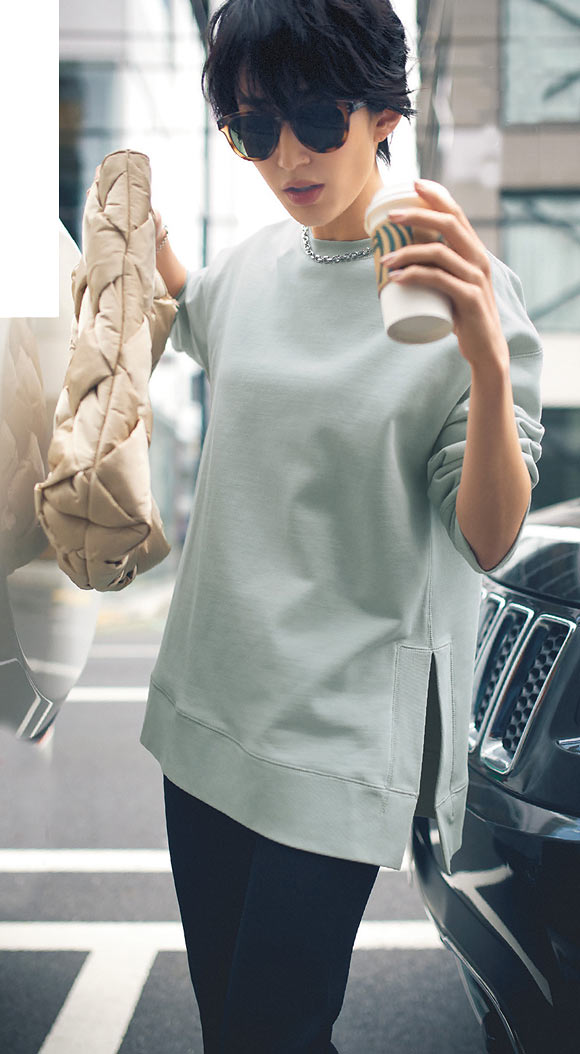 袖のほどよいボリュームとギャザー入りの首元に、サイドのスリットと丸くカットした裾のおかげでモードに仕上がる。この1枚なら、シンプルな1+1のコーディネートも洗練された印象に。きちんとしつつも、気になるお尻までカバーしてくれる、ゆるっとコンフォートな着心地も嬉しい。