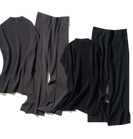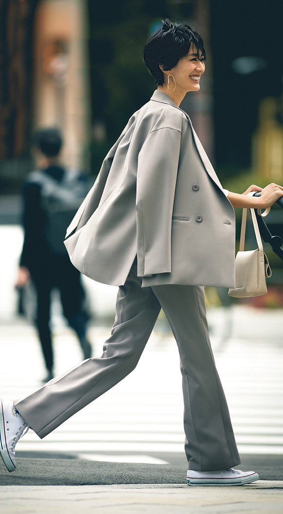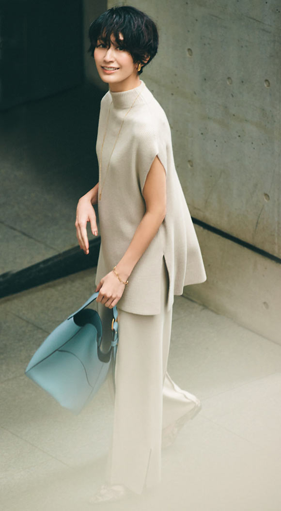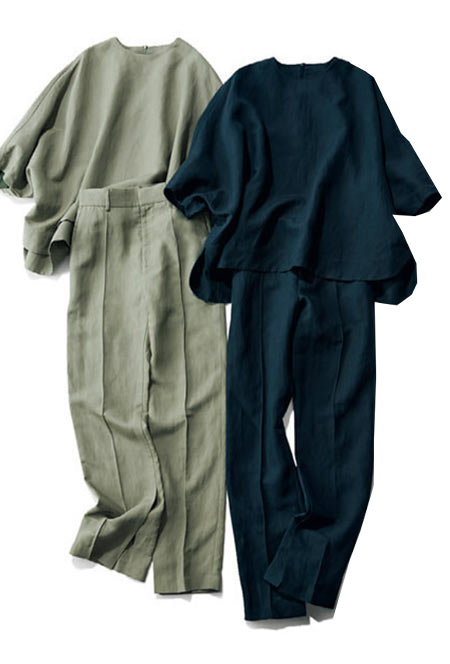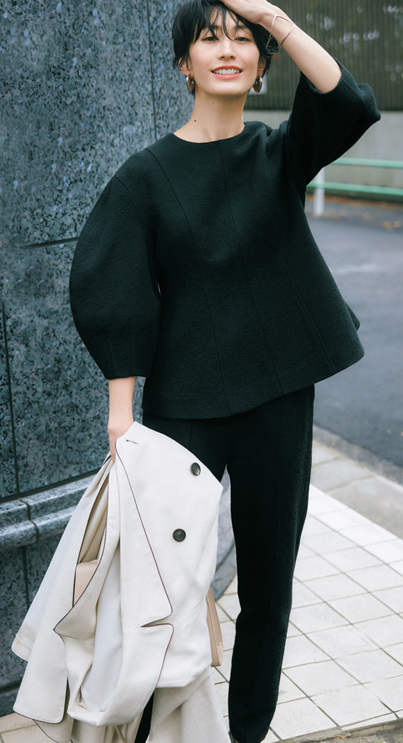 ドルマンスリーブが今っぽいシルエット。肘が隠れる袖感とサイドのスリットのバランスが絶妙で、スッキリ見えるうえ、サマになるデザイン。パンツはウエストゴム仕様ではき心地もリラックス。