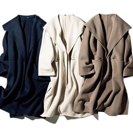 今シーズンのおすすめは、柔らかなウール素材が特徴でご近所でも着やすい膝下丈。大きな衿、肩の部分の落ち感でリラックスして着られるのもいいところで、着る人を品良く魅力的に見せてくれます。