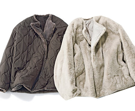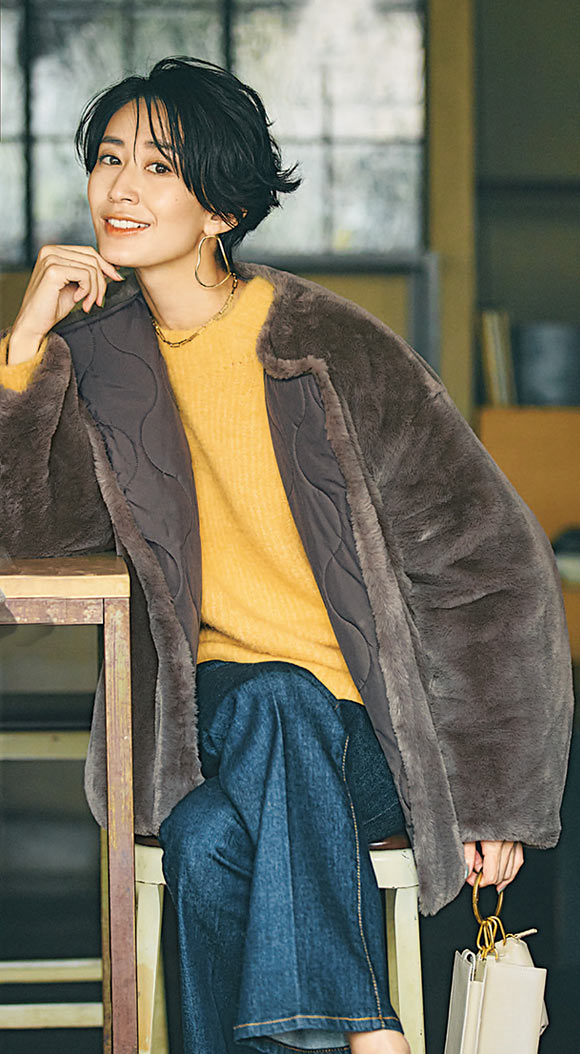ファー&キルティングのリバーシブルだからトレンドの華やかさと、近所で切られる着やすさを両立。フロントが重なる作りで襟元も暖かい。