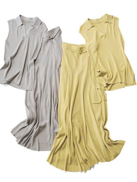 晩夏にぴったりな綿混糸のさらっと着られるニット地。同じ糸ですがあえて編み方も変えることでセットで着ても表情がアップ。上下ともに体形カバーに配慮したデザインなのも嬉しい!