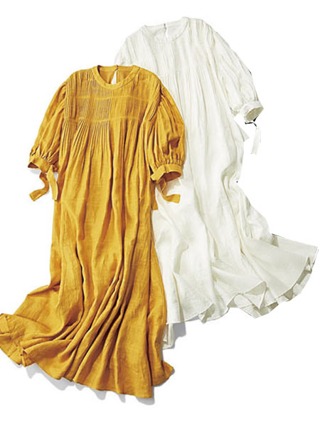 生地の分量が多く、色により印象が違うワンピース。共通して言えるのはほんのり透ける素材だから清潔感のある印象になること! カッコいい黒も、元気なイエローも、甘い白もみんな程よく大人っぽい! イエローのみ透け感のあるチェック柄。