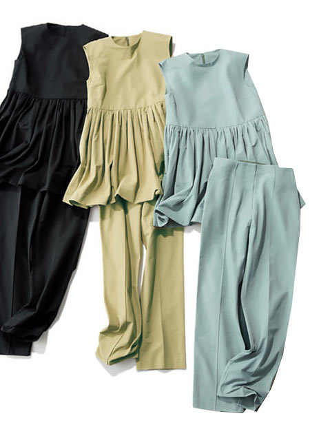 季節的にウォッシャブル素材がなんとも嬉しいポイント。トップスのサイドスリット、スカートのボリュームと丈。計算されたディテールが大人の体形もカバーしセットでもセパレートでもバランスよく着られます。
