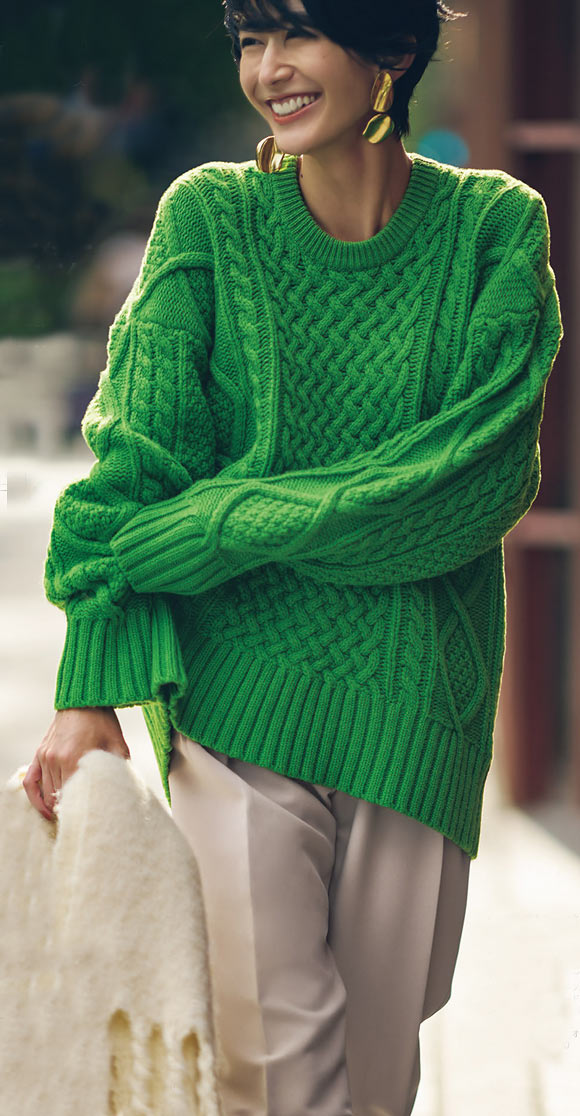 ハッと目に留まる鮮やかなグリーンはベージュのパンツに合わせると大人な印象に。ニットの優しいほっこり感も大ぶりピアスを合わせることで、ほんのりモード感をプラスします。