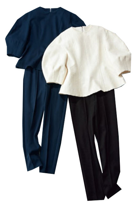 かっちり見えない素材感で、カジュアルに合わせられて使い勝手がいい! ノーカラーなのにラフに着られるポイントです。パンツはウエストにゴムを仕込んだはき心地も◎。ストレートのシルエットが細見え効果でスタイルアップしてくれます。