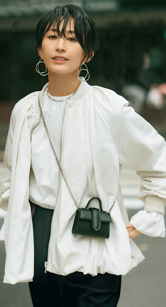写真のようにモノトーンでまとめればさらにモード感のあるスタイルに。大ぶりのイヤーカフとブローチで華やぎもプラスして。