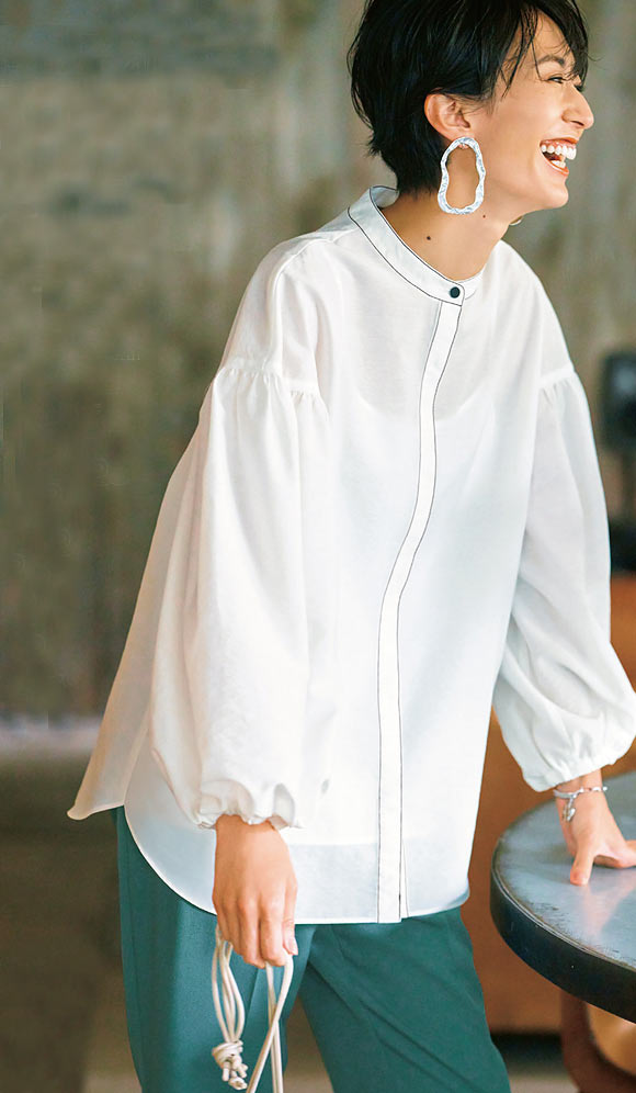 トレンド感満載の袖ボリュームブラウスは、甘い印象になりがちですが首元のボタンやステッチなどにこだわってカッコよさをプラス。肩も落ちた部分からボリュームを出すことで甘すぎずモードな印象に。