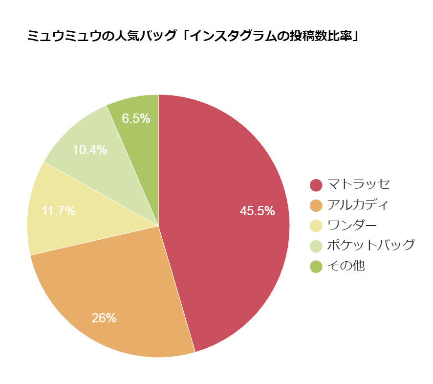 インスタグラムの「#ミュウミュウバッグ」約10,000投稿から、女性が実際に使っている投稿、プレゼントされた投稿、自分へのご褒美で買った投稿、それらを集計し算出しました。
