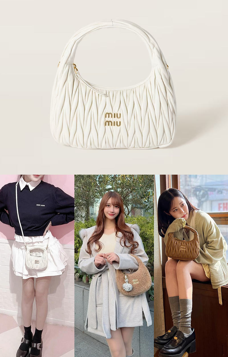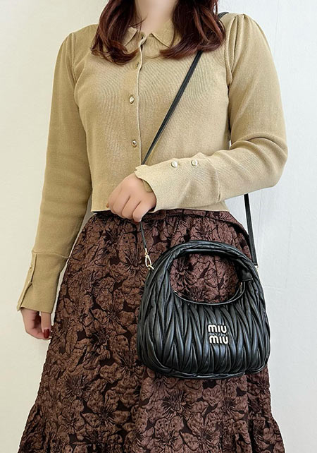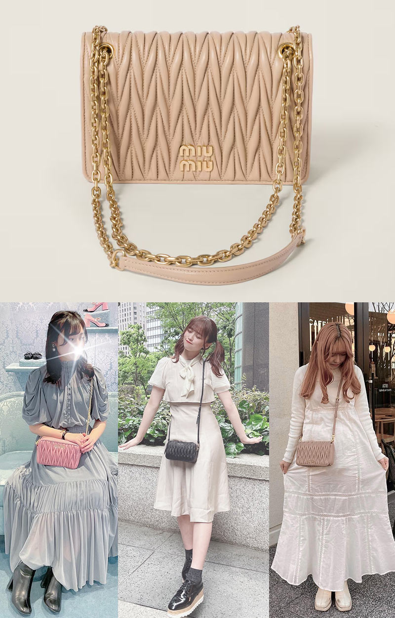 そのルックスは愛らしさと高級感に溢れており、他ハイブランドには無いミュウミュウだけの特権。マテラッセを使ったバッグは色々ありますが、特に小ぶりなショルダーバッグタイプが人気です。