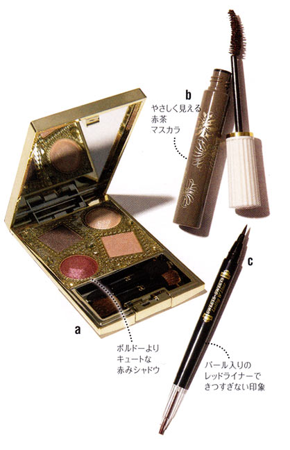 b.赤みの強いブラウンマスカラ。