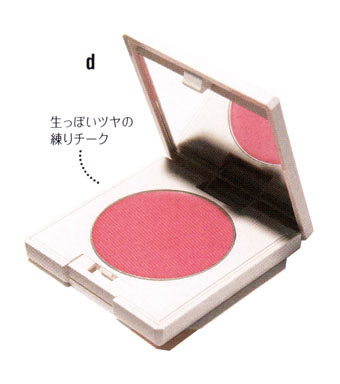 dを少量とり、ほおの高い位置を中心に広いだ円にのばしたら、つけ足して高い位置だけに重ねづけ。一度につけようとせず少しずつ重ねて。