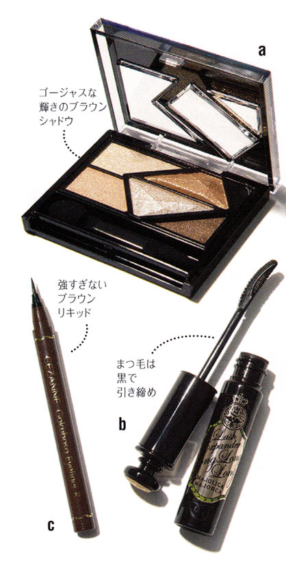 アイホールにaの左上薄ベージュ、二重幅に左下ベージュ、目のきわに右下濃茶でグラデに。右上のブロンズを目尻からまぶた半分にオン。cで目頭から目尻までラインを引き、最後はハネさせる。bを上下にたっぷりと。